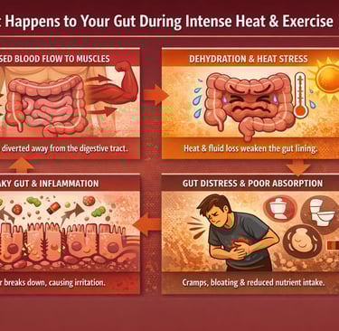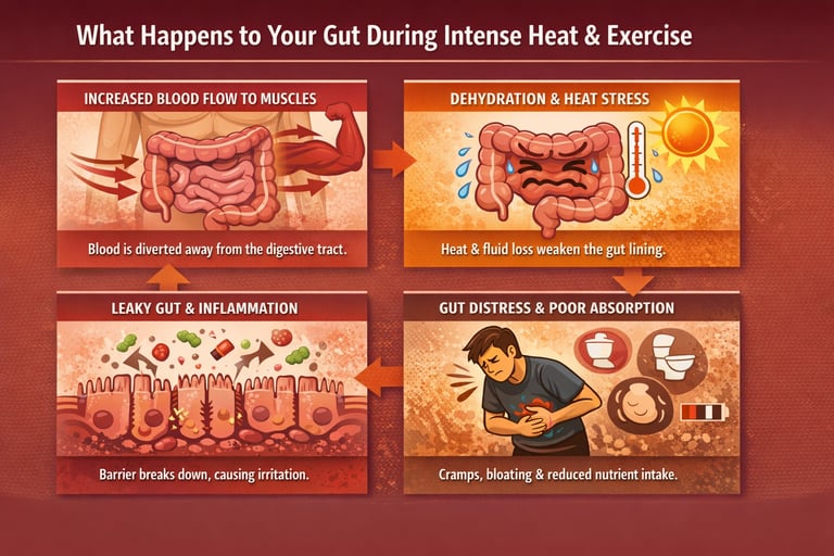 Hard training and heat don’t just drain you — they stress your gut. When intensity rises, blood flow is redirected away from digestion toward working muscles and cooling. Add heat, dehydration, and repeated impacts (running, HYROX, long rides), and the gut can become irritated and “leaky,” making you more prone to bloating, cramps, urgent toilet stops, and that heavy, off feeling that kills performance. The result is simple: if your gut isn’t coping, your hydration and energy don’t land properly either.