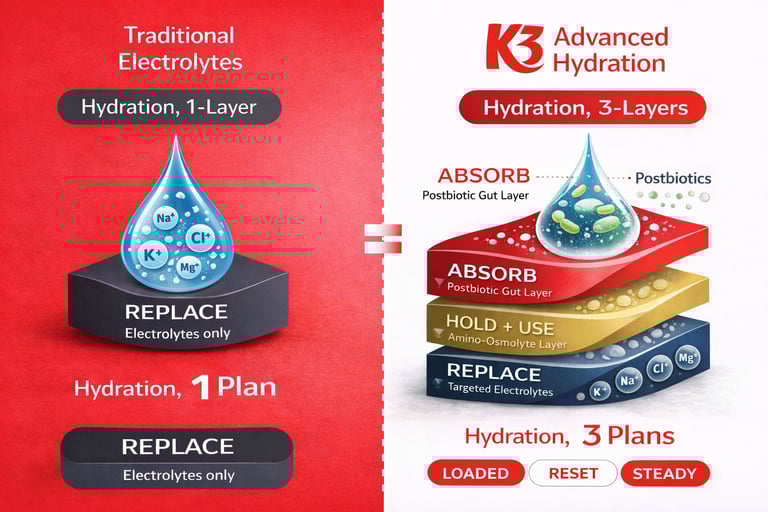 That’s where K3 is different. Most hydration products only chase electrolytes. K3 is the worlds 1st product which combines precision electrolytes with a gut support system (HydraTherm™ technology). Our postbiotic/hydration-driven approach is designed to support the gut during exercise stress while helping water move in efficiently and stay there longer. So instead of just “topping up,” you’re supporting the conditions your body needs for optimal hydration to actually work — especially when it matters most: heat, long sessions, and competition.